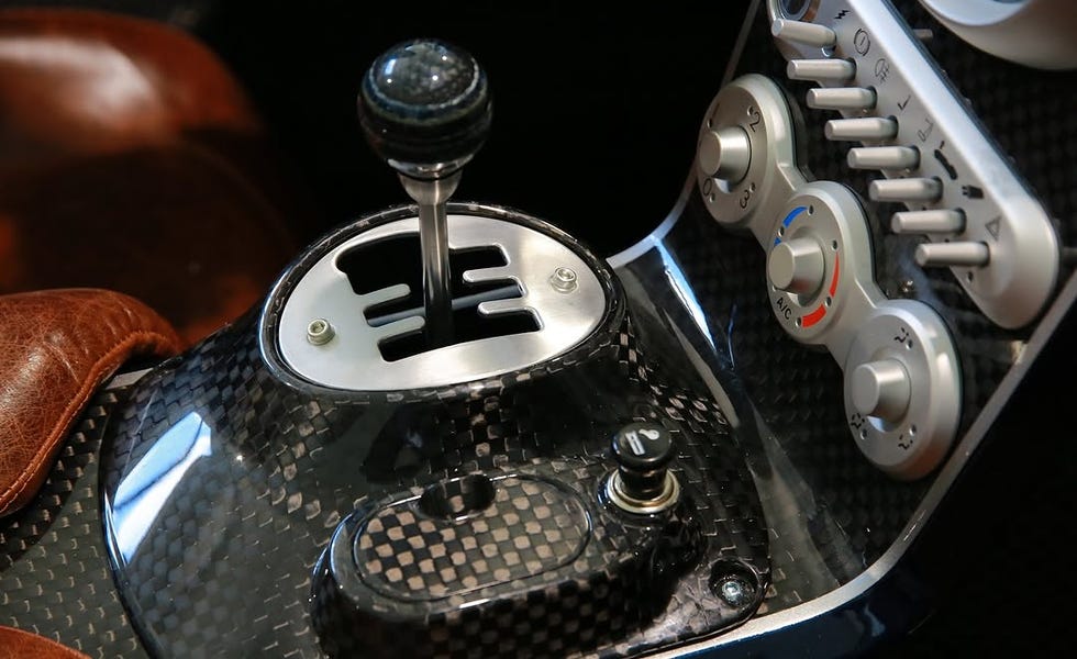 - The cockpit is devoid of screens, instead boasting aluminum and carbon-fiber trim, analog gauges, and brown leather.