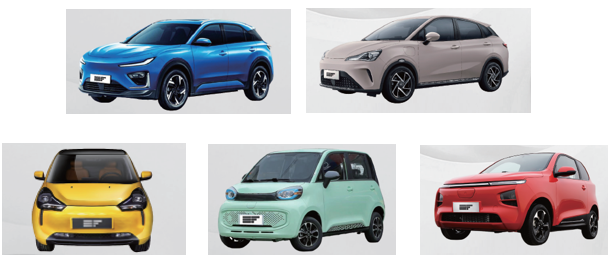 An image from a Phoenix Motor press release apparently showing the EF2, EF3, and MEV1, EMV2, and MEV3 cars. The latter looks very similar to the Ari 902, suggesting it might be rebadged from another automaker. Credit: Phoenix Motor