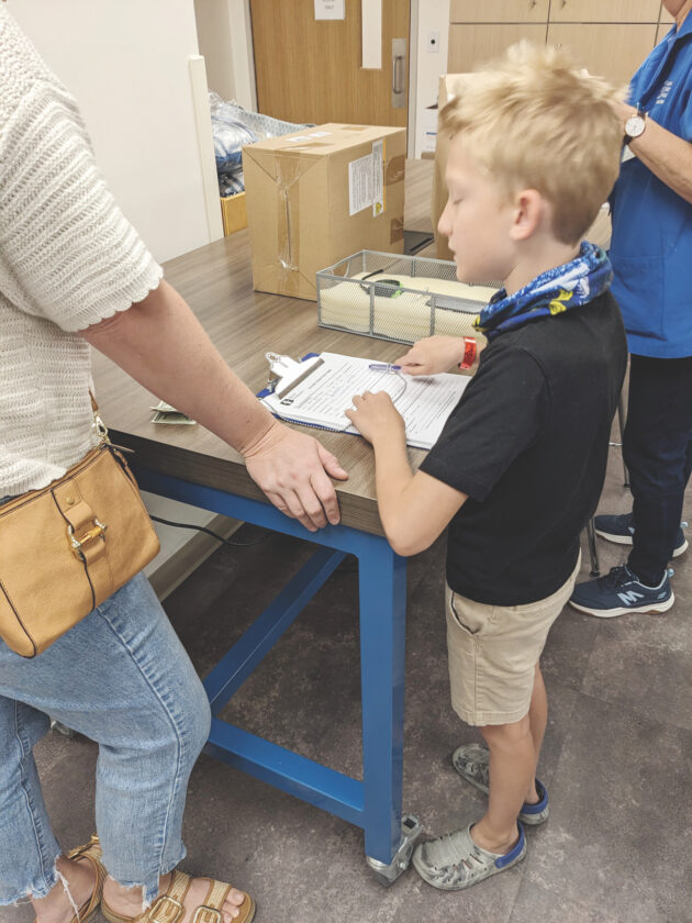 (Photo Provided) Hudson Wright, 9, of Marietta, and his mother Alisha at Akron Children’s Hospital where he recently donated 128 LCD drawing tablets for kids to play with while they are patients.