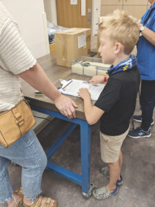 - (Photo Provided) A volunteer at the Akron Children’s Hospital accepts the donation of LCD drawing tablets from Hudson Wright, 9, of Marietta. Through his business, Hud’s Buds, he donated $1 from each sale to buy the tablets.