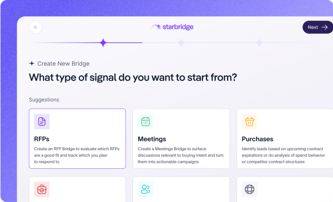 Starbridge pulls public web data sources from such sources and puts the information in one place. The sales team using the platform can see a ranked scoring, courtesy of Starbridge, of which public sector accounts are most likely to purchase new technology, and see updates like leadership changes or new initiatives.