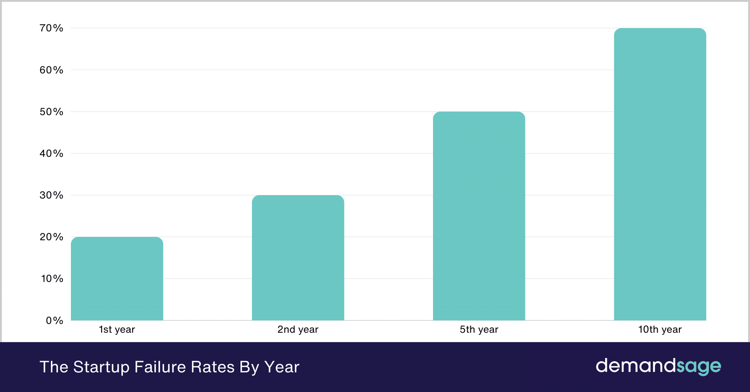 70% of startups fail between the second and fifth year. The leading cause of failure is a lack of market need for the product, which accounts for nearly 42% of closures, followed by running out of cash and team issues.
