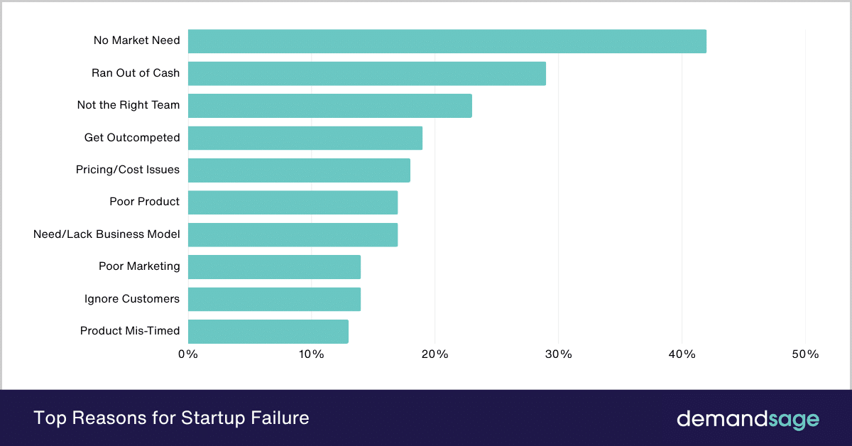 - Nearly 42% of startups fail because they fail to meet market demand with their product.
