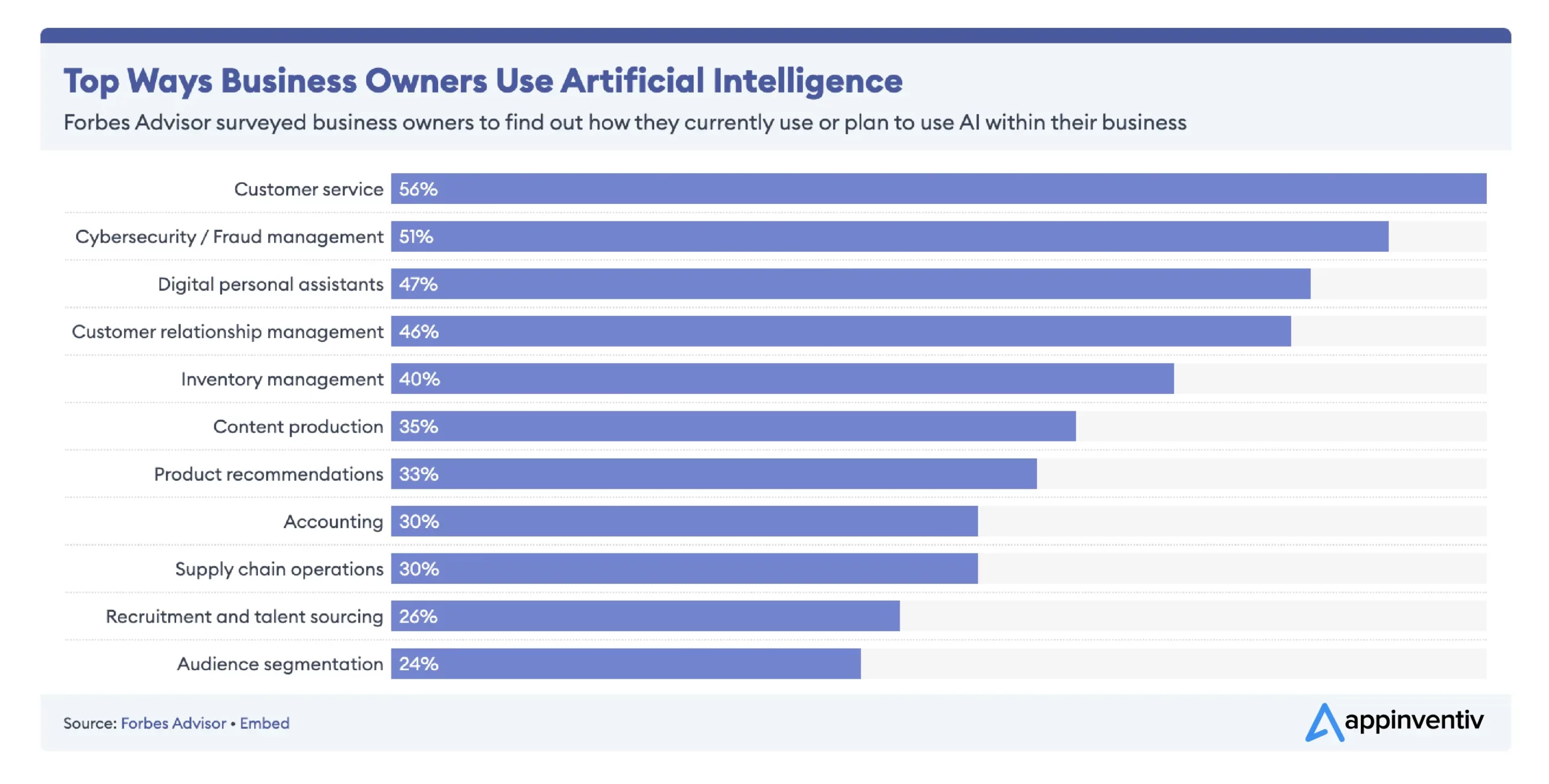 According to a Forbes Survey, businesses across multiple domains increasingly rely on AI to enhance and optimize their operations. Leading applications include customer service, with 56% utilizing AI for this, and cybersecurity and fraud management, adopted by 51% of businesses.