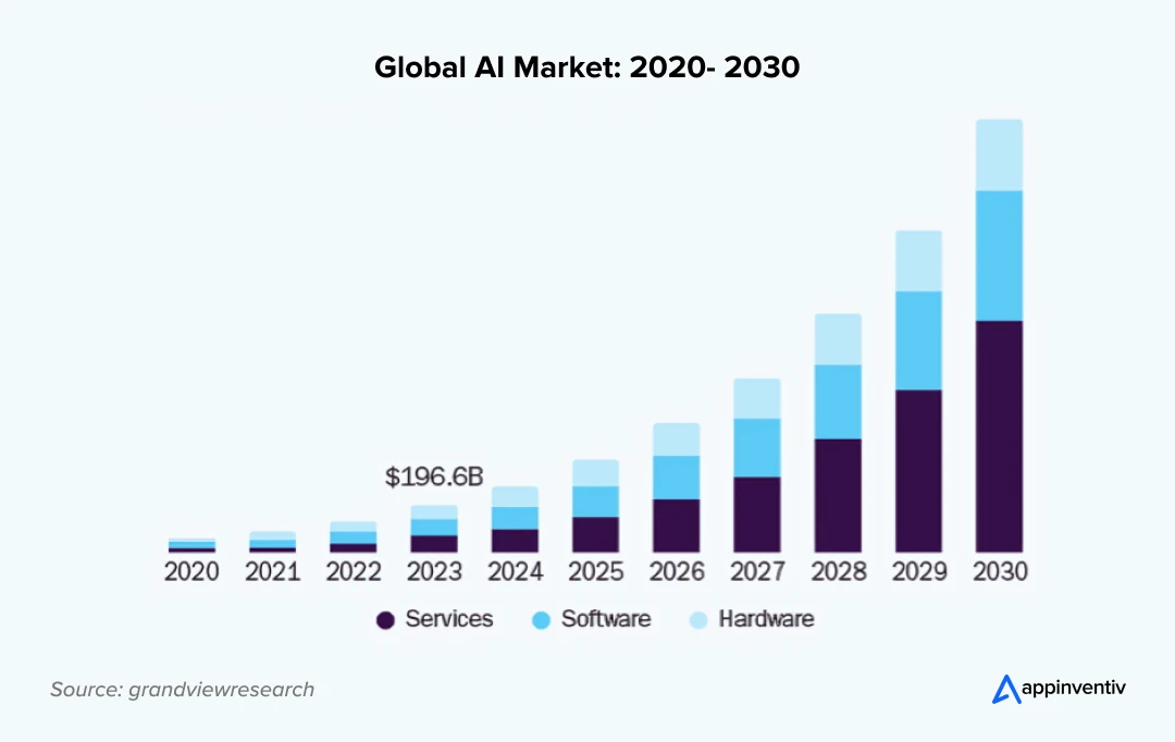 According to a report by Grand View Research, the global AI market is anticipated to reach $1,811.75 billion by 2030, expanding at a remarkable CAGR of 36.6% from 2024 to 2030. This growth is fueled by factors such as advancements in machine learning, broader adoption across industries, and increasing demand for automation and data-driven solutions.