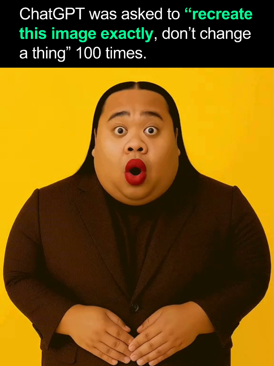 What happens when ChatGPT is asked to recreate the same image 100 times? AI engineer Michelle Yang instructed the model to regenerate an identical image with zero changes, 100 times in a row. Initially, the image remains recognizable, but subtle shifts in facial features, proportions, lighting, and detail compound with each generation until the final result barely resembles the original. Because the model is not copying pixels, it reconstructs the image from learned patterns each time. When those outputs are repeatedly fed back into the system, small errors accumulate and noise grows. A phenomenon known as model collapse, where learning from oneβs own outputs degrades accuracy and structure. π¨ Follow @ai.disruptor for the latest in AI and tech innovation. Credit: @elle DM for credit/removal (no copyright intended) #ai #artificialintelligence #chatgpt #prompt #tech