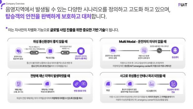 In the case of existing E-call services provided by companies like Hyundai, GM, BOSCH, and BMW, high dependency on terrestrial networks makes them limited in shadow areas such as tunnels or mountains. Terrestrial networks are concentrated only in densely populated areas, making it difficult to handle unstable communication or disaster situations. By establishing a satellite and AI-based hyper-connected safety net, Fuit enables rapid and accurate rescue support for passengers without interruption in any emergency. The company is also advancing its technology by defining various scenarios that could occur in shadow areas. Furthermore, in collaboration with a global corporation, Fuit is developing a satellite messaging solution that can be applied to vehicles, ships, and Urban Air Mobility (UAM).