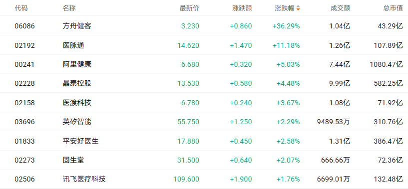 AI healthcare concept stocks in the Hong Kong stock market collectively surged, $FANGZHOU JIANKE (06086.HK)$ with some rising over 36%, $MEDLIVE (02192.HK)$ others gaining more than 11%, $ALI HEALTH (00241.HK)$some increasing by over 5%, $XTALPI (02228.HK)$ rose more than 4%, $YIDU TECH (02158.HK)$ with some rising over 3%, $INSILICO (03696.HK)$ and certain ones exceeding 2%.