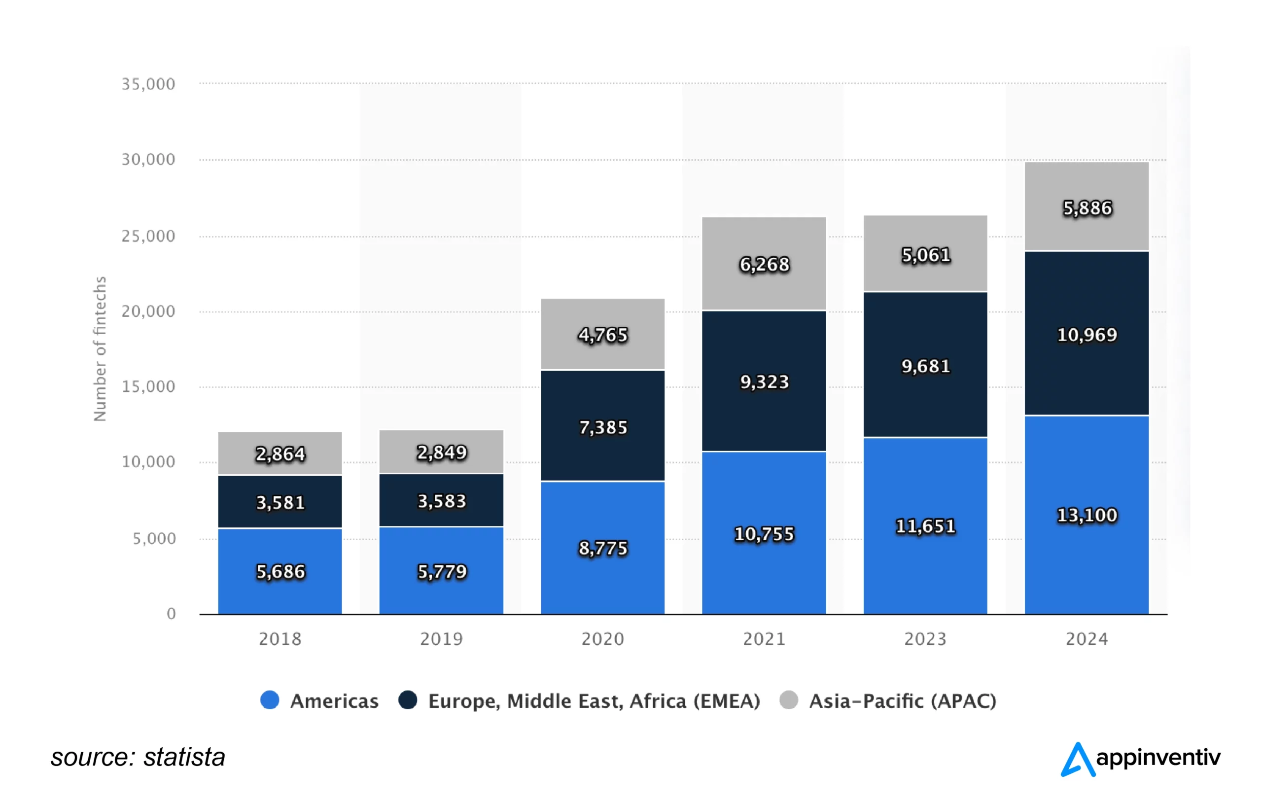 The adoption rate of FinTech apps is so rapid that the number of FinTech startups in the U.S. has doubled in the last five years. In 2024, the global FinTech user base, especially in digital payments is forecasted to exceed 3.5 billion.