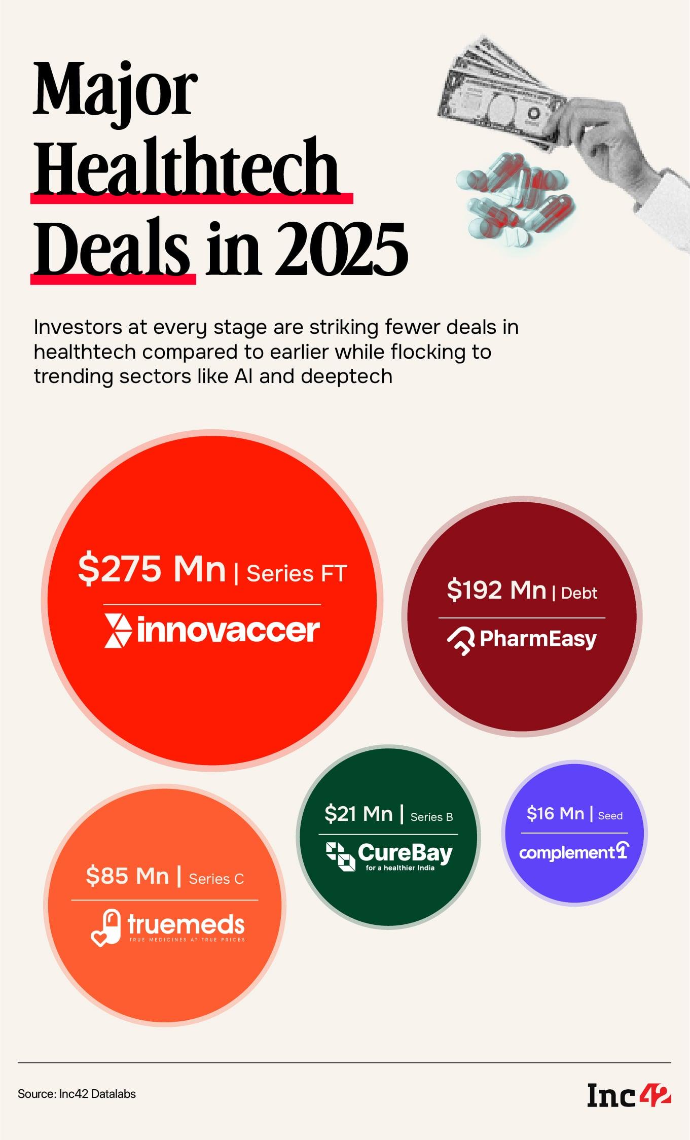 Marquee rounds like Innovaccer and PharmEasy have kept total funding steady, but early and growth stage activity has thinned significantly
