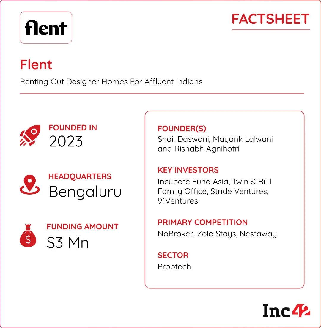 Founded in 2023, Flent offers fully furnished designer rental homes for young professionals. Its full-stack approach combines managing properties for owners while streamlining tenant experiences. With INR 1 Cr in monthly GMV, the startup targets tenants looking for sub-INR 33,000 rents and lower deposits.
