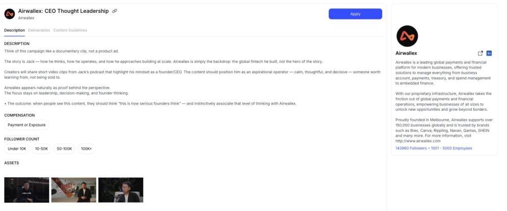 This week, the SMH ran a story on Airwallex hunting for online influencers they’ll pay to praise CEO Jack Zhang on his “thought leadership” on the B2B influencer marketing platform Partnar.