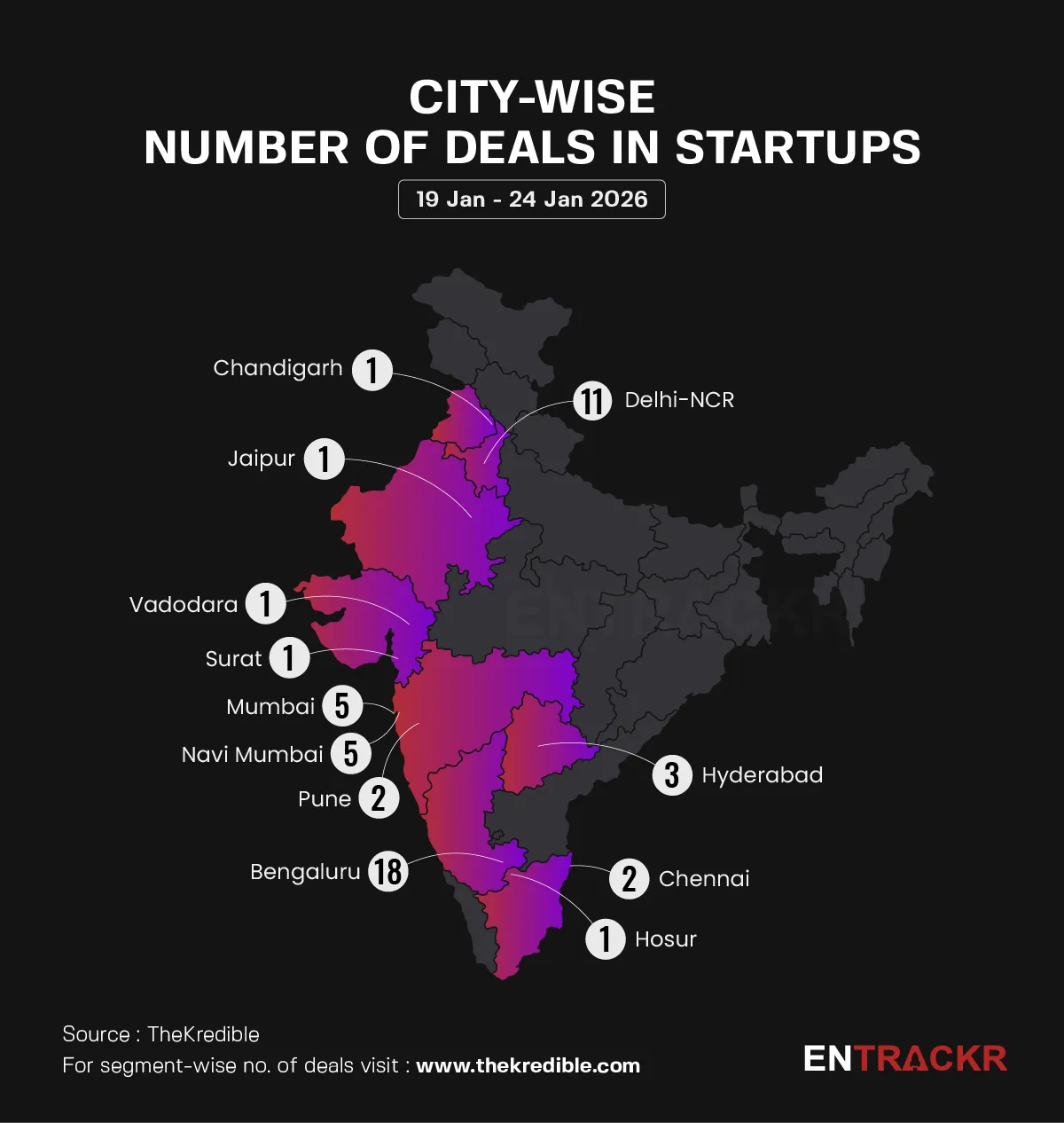Bengaluru led the city-wise deal count with 18 deals, followed by Delhi-NCR and Mumbai with 11 and 5 deals, respectively. Startups from Hyderabad, Pune, Chennai, Jaipur and others also bagged funding this week.