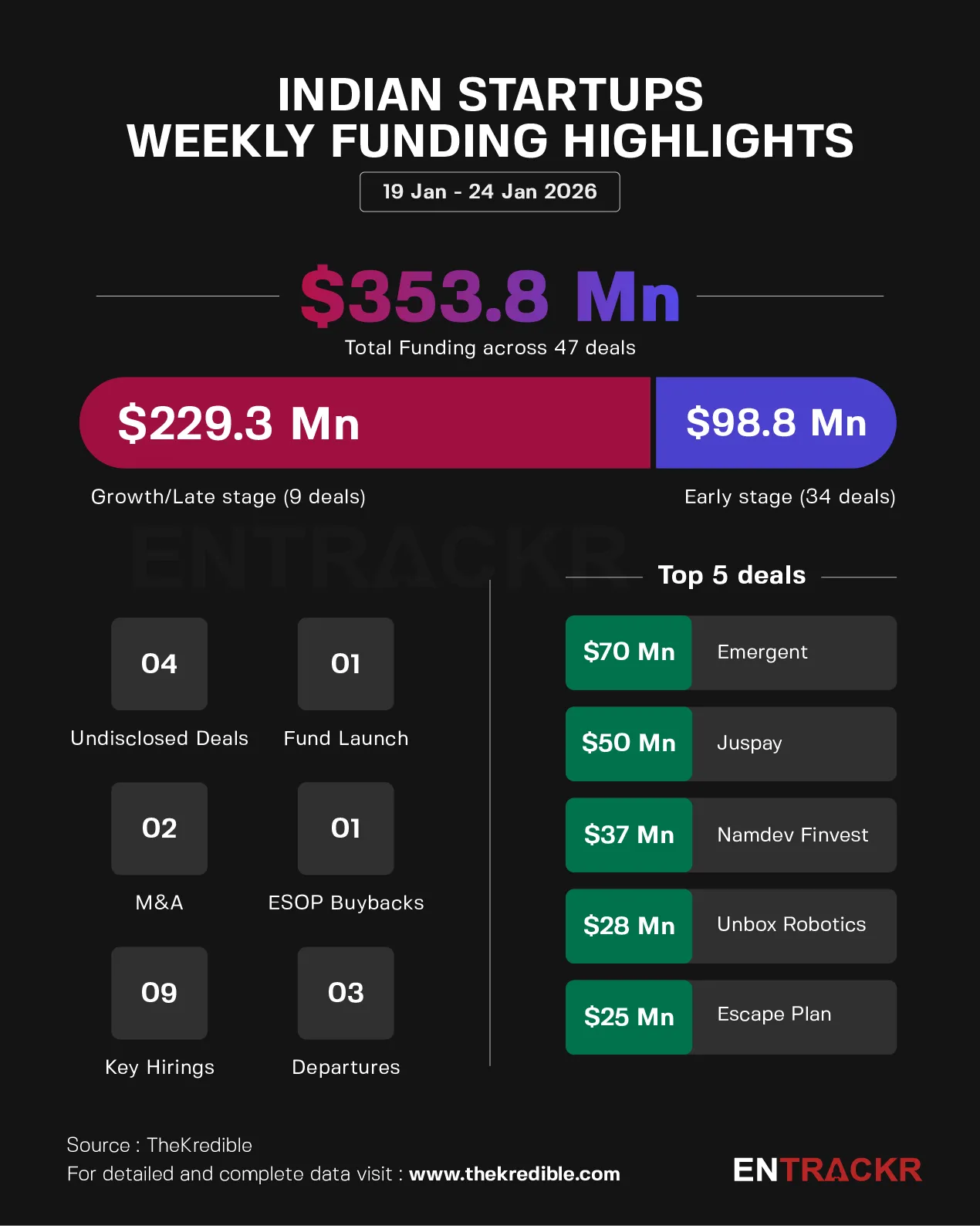 This week, 47 Indian startups raised around $353.81 million, comprising 9 growth-stage and 34 early-stage deals, while 4 startups kept their funding undisclosed.