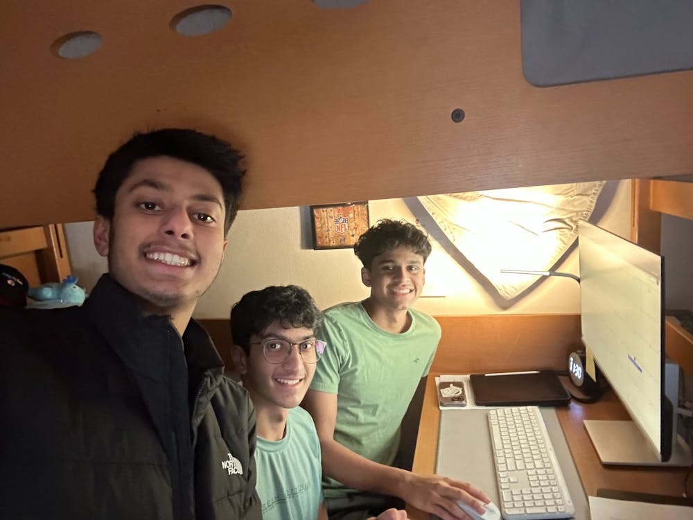 From left to right, Armaan Jain, Joshua Saji and Jay Dixit work to develop their website Priority in a dorm room in February 2025.