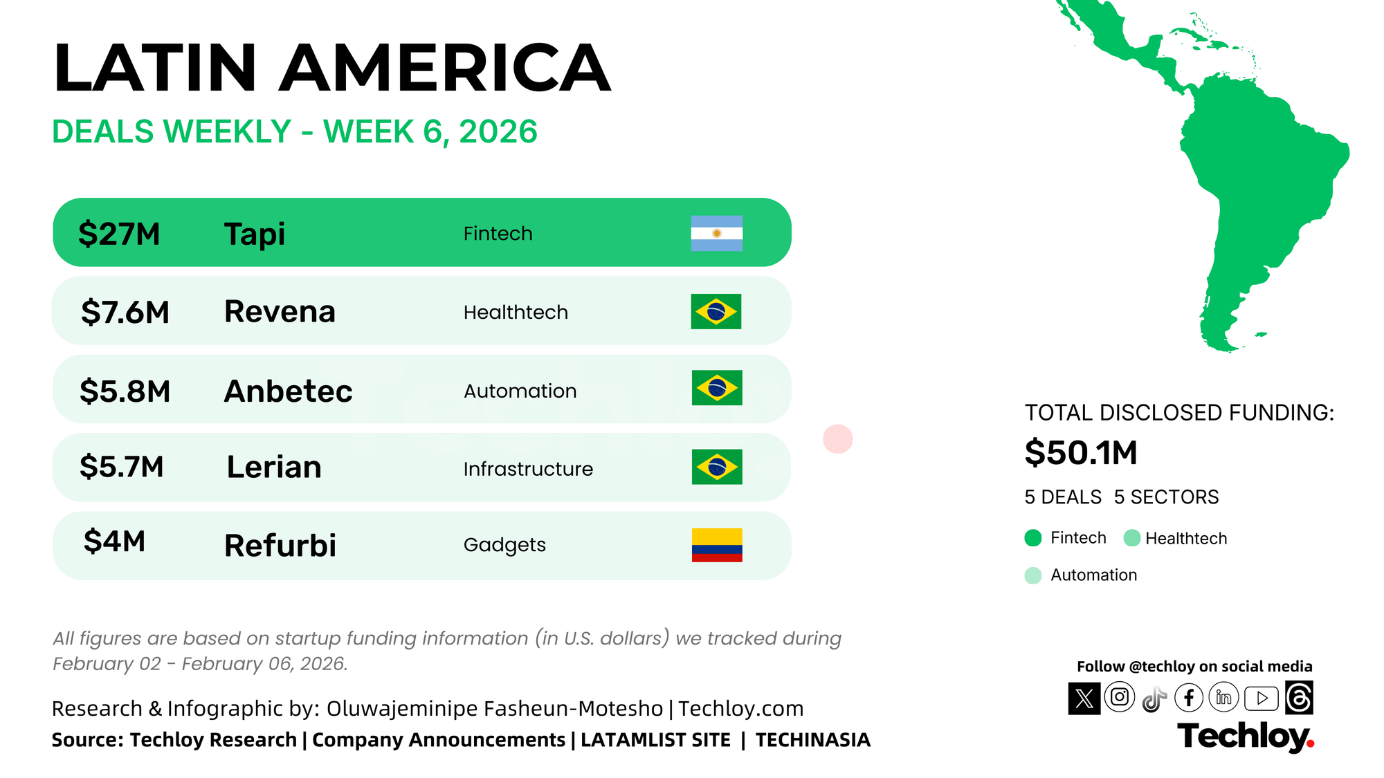 Startups across Latin America raised a combined $50.1 million this week, based on disclosed funding rounds tracked by Techloy, with most investor capital going into fintech and financial infrastructure platforms. A small number of mid-stage and growth deals accounted for the majority of the funding activity.