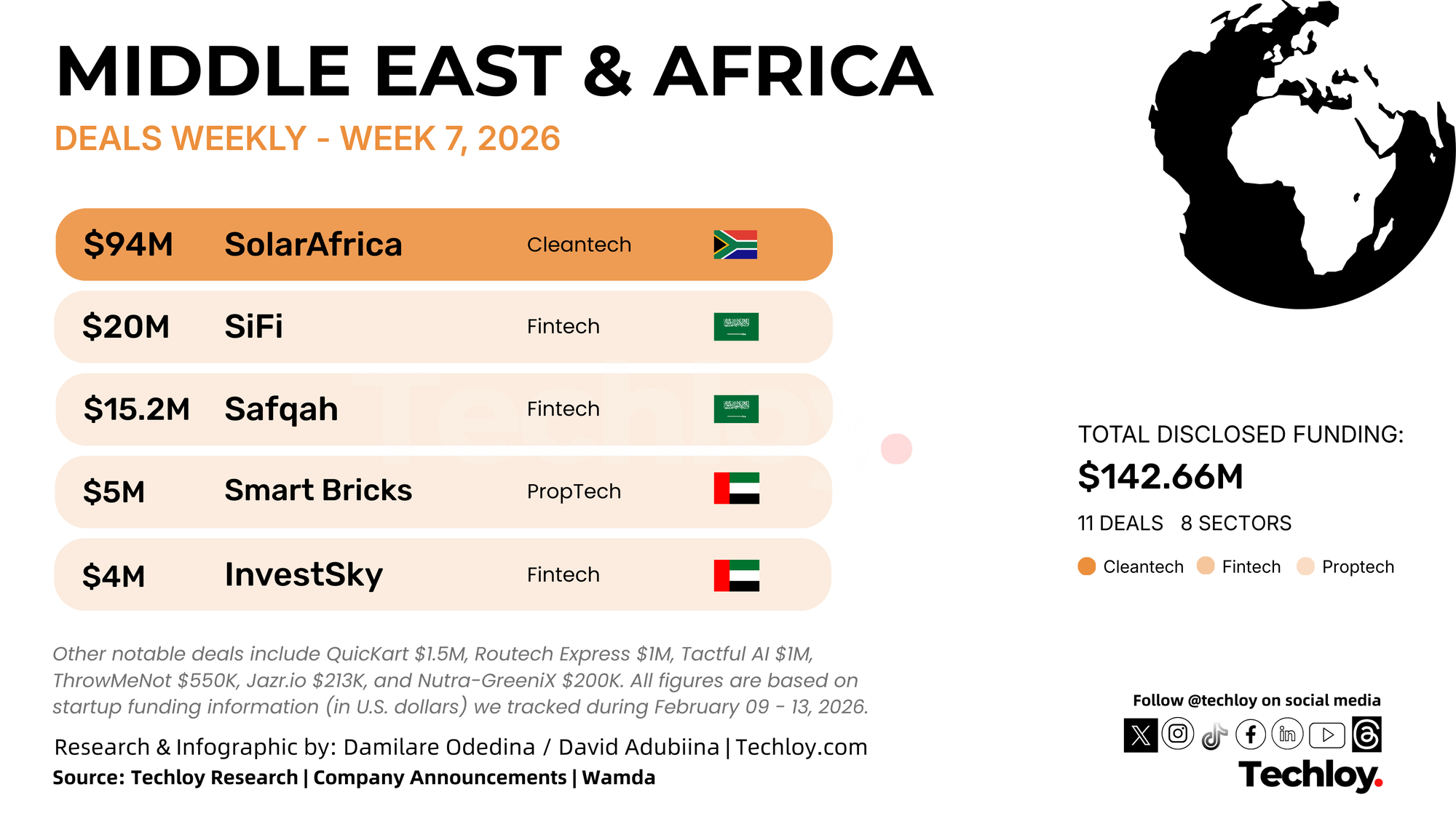 With $142.66 million raised this week, most investor money in Africa and the Middle East went to renewable energy and fintech. SolarAfrica’s $94 million debt facility alone accounted for 66% of total capital. Early-stage rounds stayed small compared to growth deals.