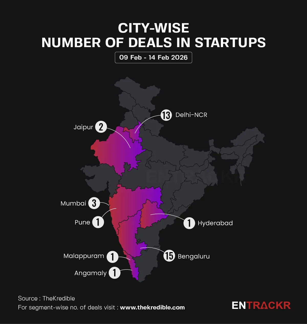 Delhi-NCR topped the city-wise deal count with 15 deals, while Bengaluru led in total funding, raising $93.57 million across 13 deals. Mumbai, Jaipur, Hyderabad, Pune, Anngamaly and Malappuram also secured deals during the week.