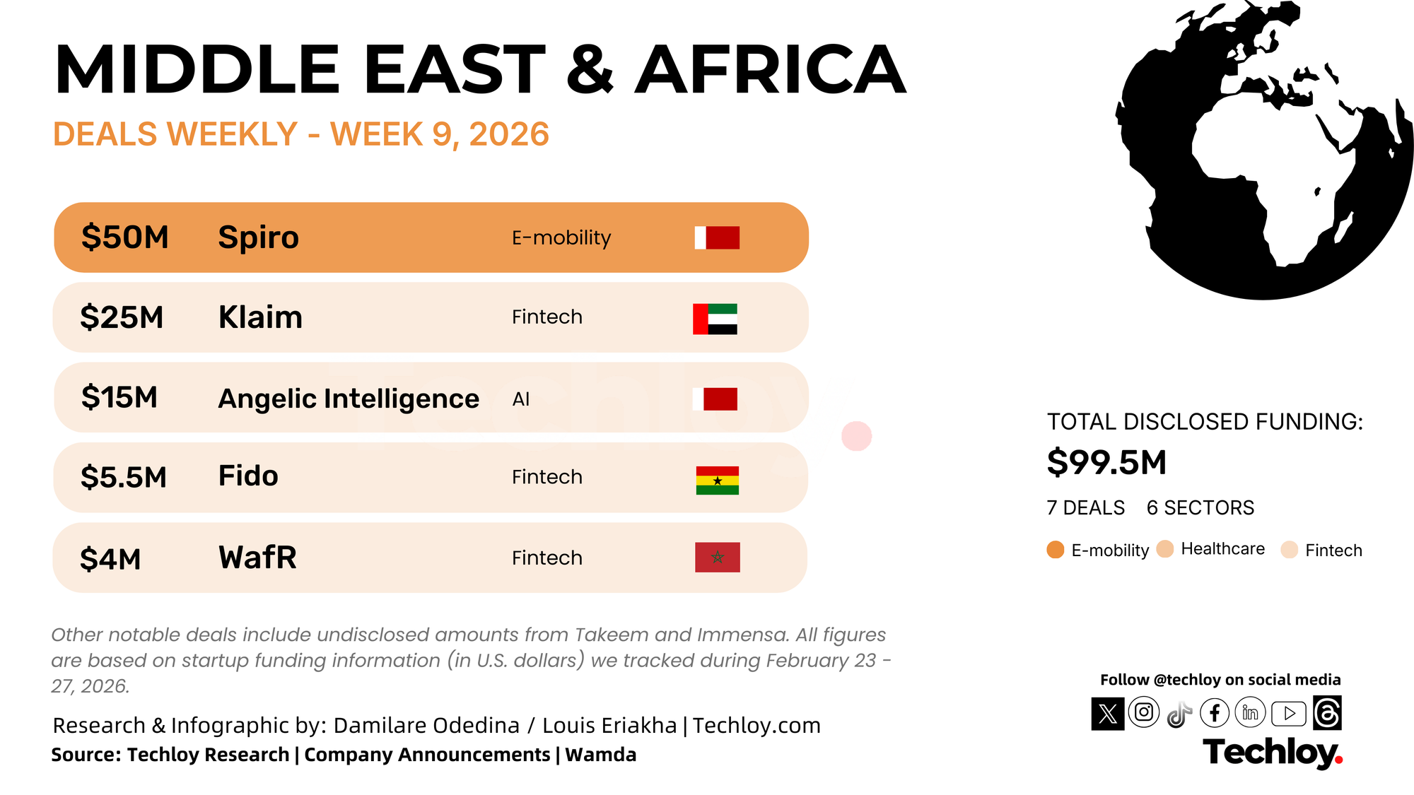 With $99.5 million in disclosed funding this week, most investor money in Africa and the Middle East went to electric mobility infrastructure and healthcare payments. Spiro’s $50 million debt facility alone accounted for 50% of total capital. Three of the top four deals came as debt financing rather than equity, showing strong investor confidence in recurring revenue models.