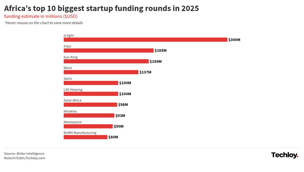 In 2025, off-grid energy startup d.light raised $300 million, the largest single startup round recorded on the continent, according to data compiled by Briter. A few months earlier, another solar platform, Sun King, secured $156 million. Around the same time, fintech firms Zepz and Wave raised $165 million and $137 million, while mobility startup Spiro pulled in $100 million to expand its electric motorcycle network.
