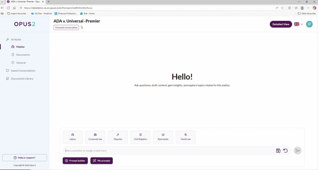 Opus 2 highlighted three new AI tools. Matter Assist allows lawyers to get answers sourced from all documents across a case. Document Assist enables specific queries on one document or set of documents. General Assist is an enterprise LLM for handling research, drafting, and analysis not tied to case documents. All of these tools include access to a prompt library and prompt builder.