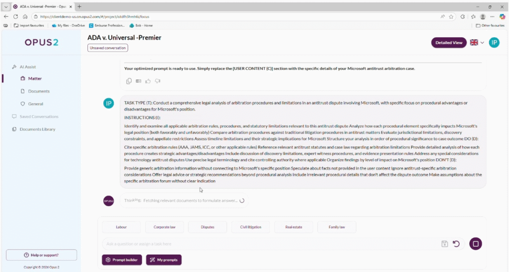 The advantage over doing the same thing in Gemini or ChatGPT is that here, it’s a closed system that never compromises confidential case information. Lawyers can generate summaries in Matter Assist or Document Assist, then move to General Assist to use the output to draft an email, outline arguments or prepare talking points without exposing it to public AI tools.