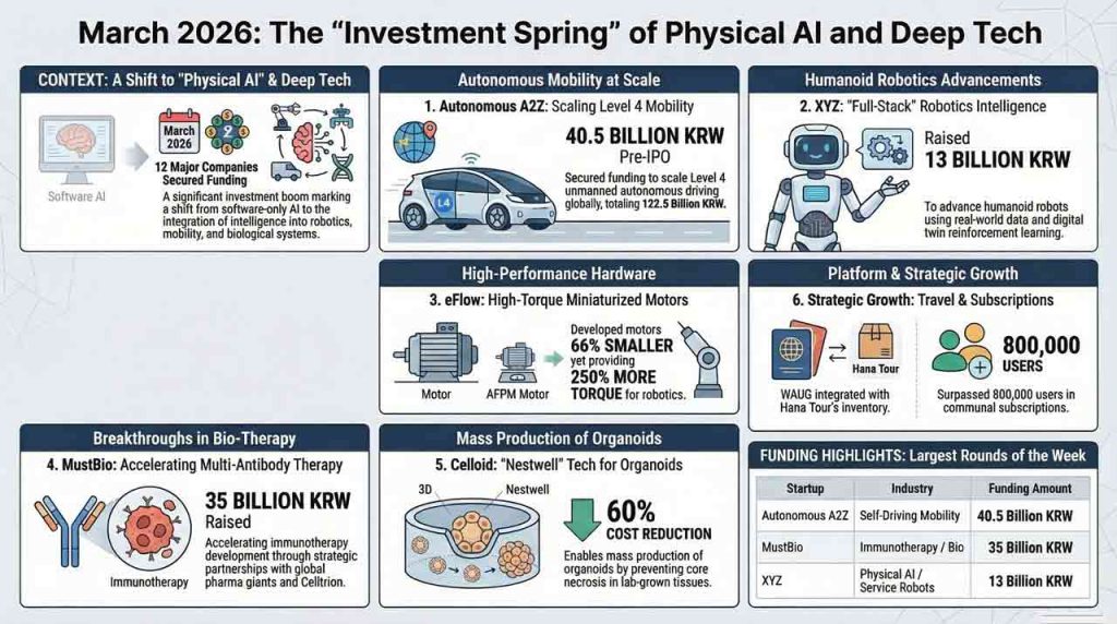 South Korea’s startup investment activity in mid-March offers a clearer view of where deep-tech innovation is heading. Funding rounds across autonomous driving, robotics, and biotechnology show investors backing technologies approaching real-world deployment. The latest capital flows suggest that Korea’s venture ecosystem is moving beyond pure software AI toward systems designed to operate in physical environments such as mobility, healthcare, and robotics.