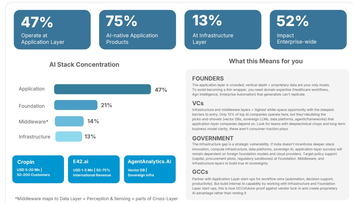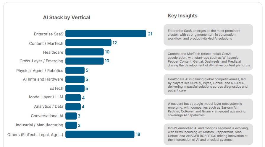 India’s top AI start-ups are concentrated at the application layer, led by Enterprise SaaS, Content/MarTech, and Healthcare