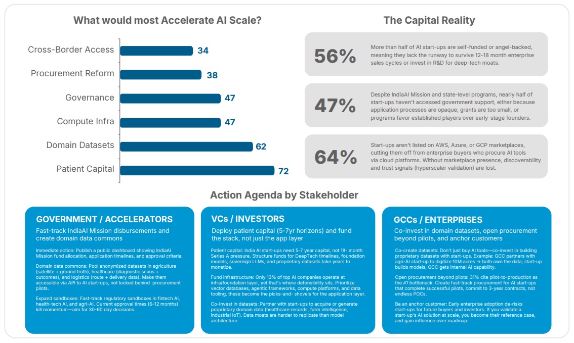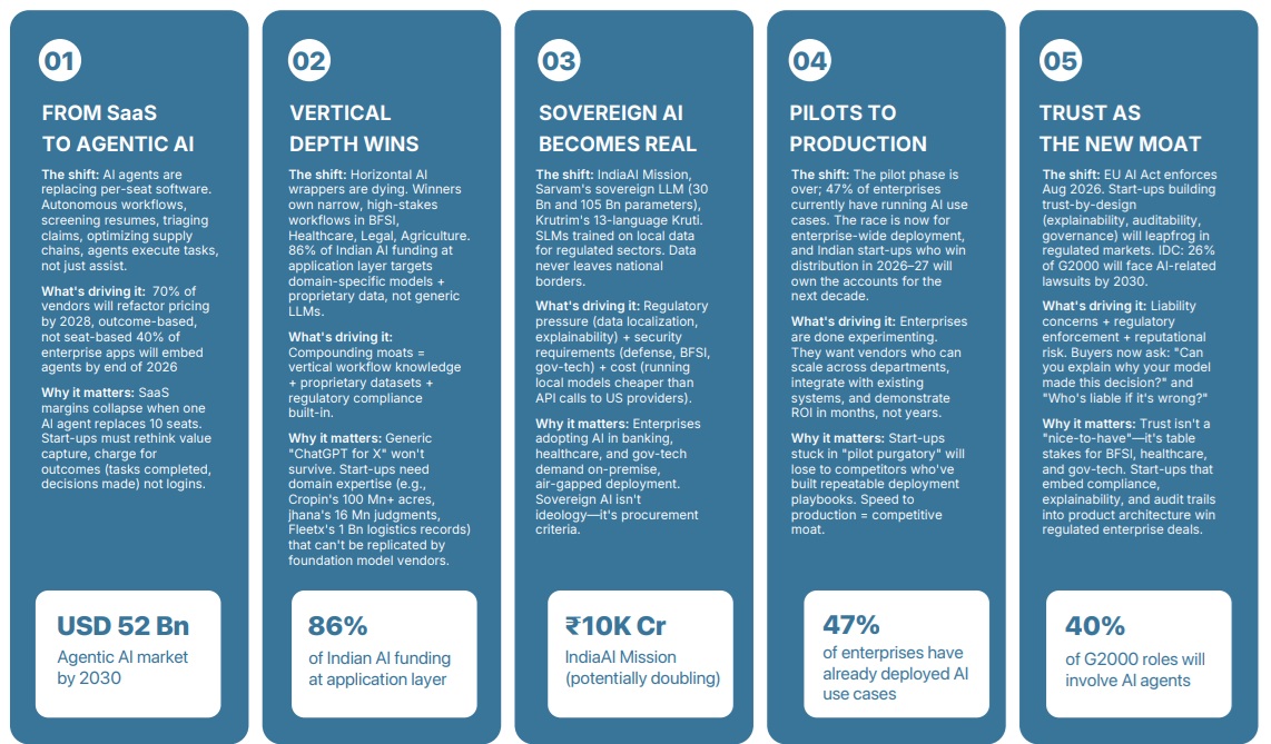 Investment flows to: (a) autonomous B2B agents with deep vertical integration (BFSI, Healthcare, Legal, Agriculture), (b) sovereign AI infrastructure (compute, models, governance), and (c) proprietary datasets.