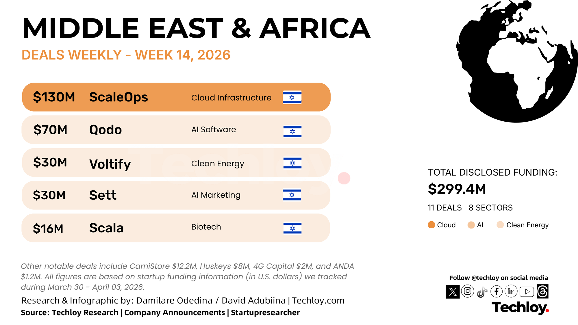Startups across Africa and the Middle East raised a combined $299.4 million this week, based on disclosed funding rounds tracked by Techloy, with investor capital flowing primarily into AI infrastructure and cybersecurity. A small cluster of large Israeli growth-stage deals accounted for the bulk of that figure, though the week also produced meaningful activity in the UAE, Kenya, and Angola.