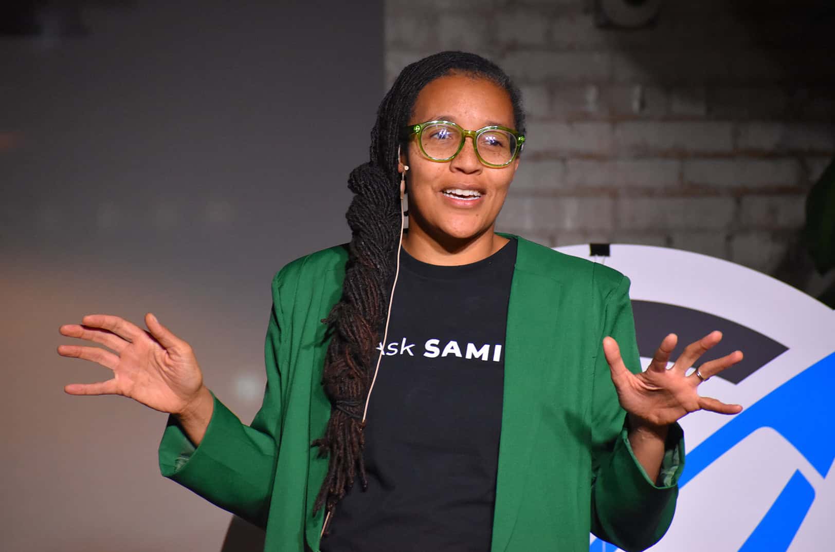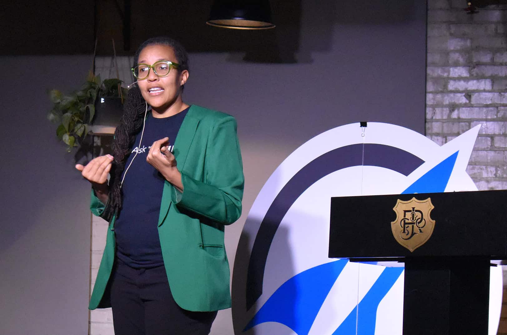 Dr. Brandy Archie delivers her pitch for AskSAMIE during a LaunchKC celebration in November 2025; photo by Tommy Felts, Startland News