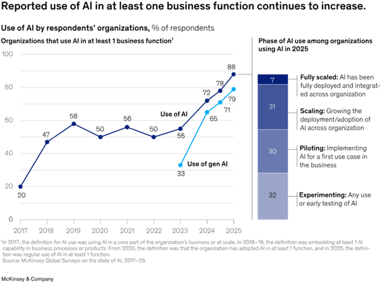 AI adoption statistics certainly make for good headlines. A recent McKinsey study revealed that the use of AI in at least one business function continues to increase. 88% of businesses report regular AI use compared to 78 last year.