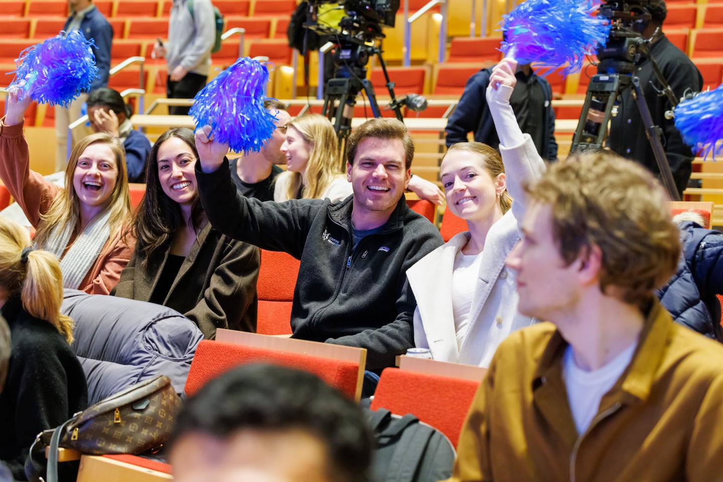 Usually a buttoned-down venue for hosting investment conferences or talks by star executives, the hall was primed for a more raucous affair that night, as hundreds of friends and family of the student founders came to cheer, equipped with pom-poms and handwritten signs more typical of a Beanpot hockey final.