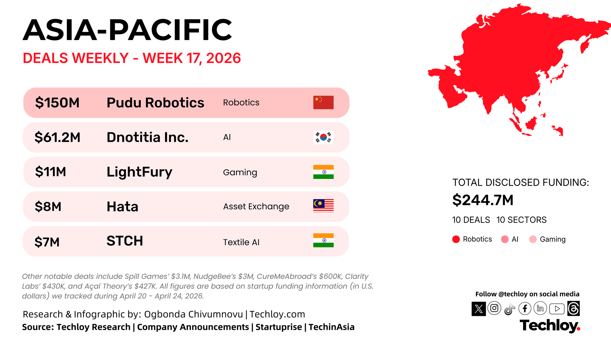 This week’s funding activity highlights continued investor interest in AI-powered automation, robotics, and semiconductor technologies, alongside growing support for gaming, enterprise AI, and digital asset platforms. While large rounds were concentrated in robotics and chip infrastructure, early-stage investments across India and Southeast Asia show that consumer platforms, healthtech, and food startups are also attracting capital as Asia’s startup ecosystem continues to diversify.