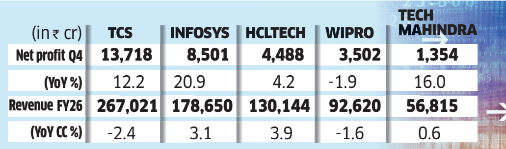 Outlook: On Thursday, Infosys guided for revenue growth of 1.5%-3.5% for FY27, slightly below street expectations, and said the demand environment is stable but still not robust.